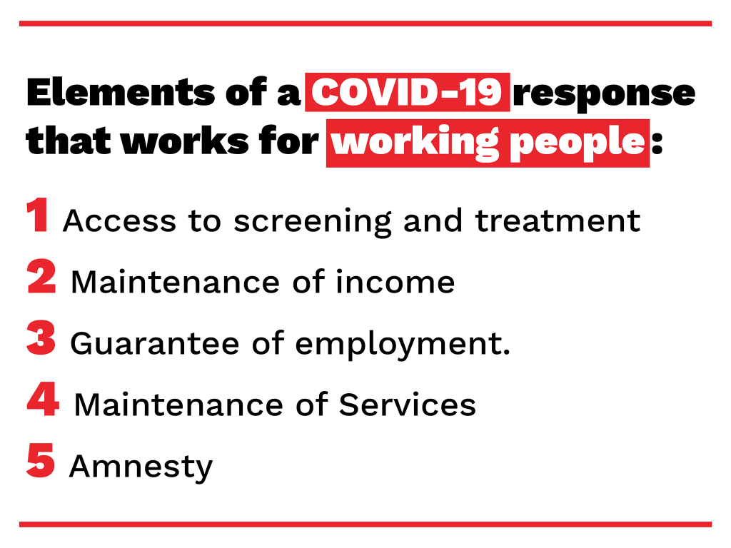 - Amnesty: There can be no barriers to testing and treatment of all people in the area if the pandemic is to be contained. There needs to be explicit guarantees provided by officials at ALL levels that the screening and treatment system will not be employed to entrap individuals. This is a public health issue as well as a political demand. It is impossible to have an effective public health response if ten million people with unclear or no citizenship status refrain from screening for fear of deportation.