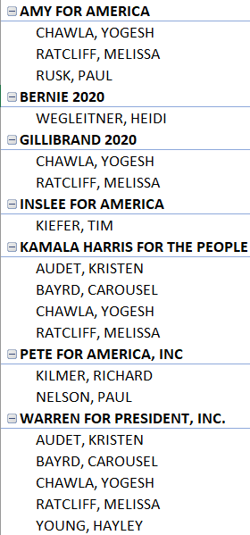 Mayor Satya Rhodes-Conway donated to every neoliberal identity candidate (Klobuchar, Booker, Castro, Harris, and Warren), but gave most to Pete Buttigieg, the only LGBTQ candidate in the race and a personal contact of hers through the Mayors Innovation Project; Rhodes-Conway likewise campaigned for mayor as an LGBTQ candidate who wanted to address race disparity in Madison. Most city alders didn’t donate to a political candidate, save for Arvina Martin, who gave small amounts to Gillibrand, Harris and Warren, and Sally Rohrer, graduate student in public policy, who donated to Warren. Half of the twenty (20) city alders gave to the Wisconsin Democratic Party; the other half gave no political donations at all.