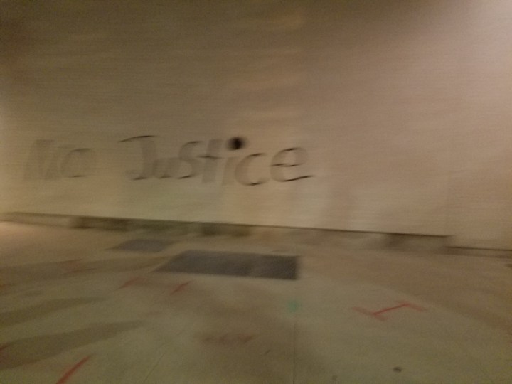 I saw a crowd of people pushed against the wall of racism with no other way to express their anger at a system that kills black people daily. But I also saw a crowd that took care of each other the best they knew how. And I saw a police force that was violent and uncaring to the people it should be protecting. In the middle of that afternoon, while standing near a cop, I heard a person ask if that cop was there to protect people or property; the cop responded “people”, but as the night went on their actions showed it was property, not people, that they cared about.