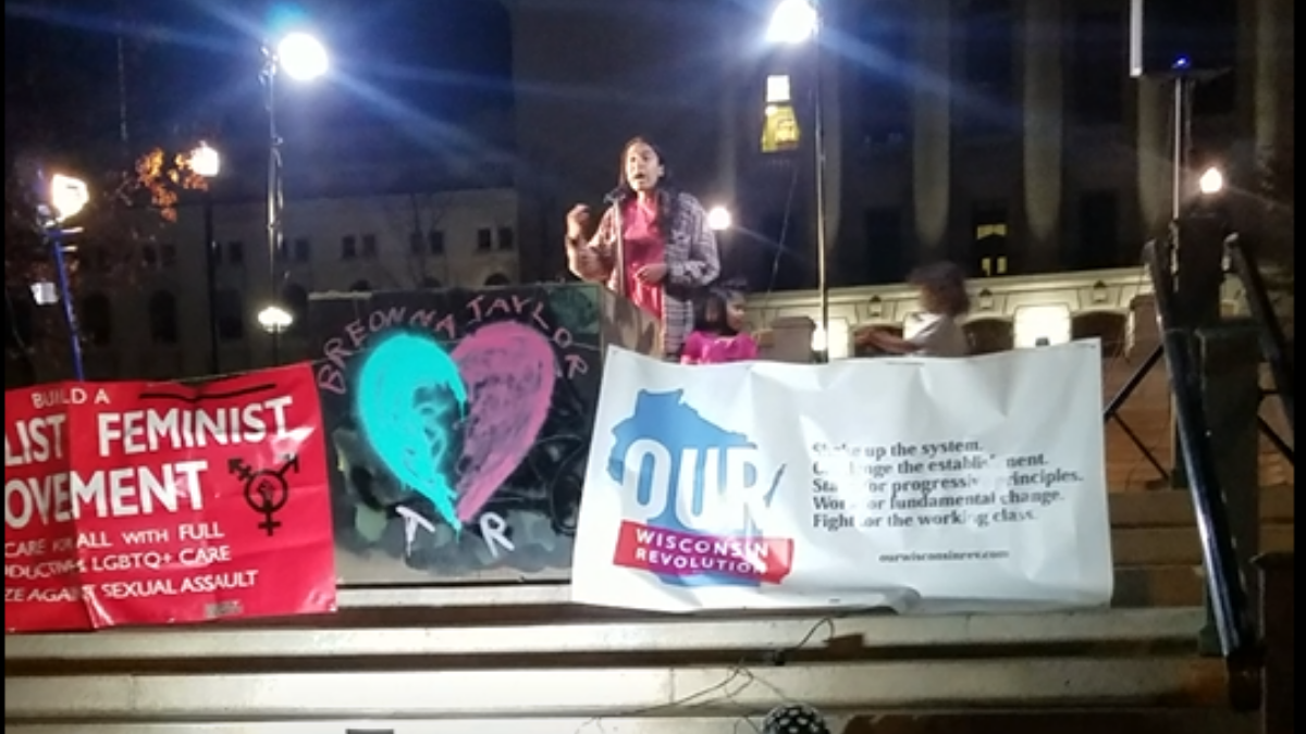 On behalf of the DSA and on behalf of my brothers out with Black Umbrella, with LINK, I want to raise our collective voice and actually announce my candidacy for District 4 Alder [on the Madison Common Council]. We’re tired. We’re ready for a new Madison. We are ready to raise the voices of everybody here and everybody who couldn’t vote. Because in the end, voting is still a privilege that is not extended to incarcerated people, that is not extended to undocumented folks. And they’re still getting taxed and they’re still getting counted for all of the population and it’s fucked. It’s fucked! If I know something about this country’s history, it’s that there was a revolution about taxation without representation at some point.