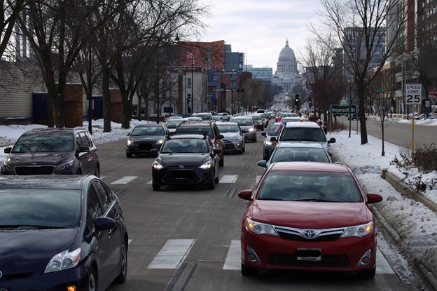 Saturday’s action, initiated by the Madison DSA and involving Socialist Alternative, Allies for Black Lives, Sunrise Movement, Impact Demand, Our Wisconsin Revolution Dane County, WI WILL WIN, Urban Triage, and the Teaching Assistants Association, began at the Wisconsin State Capitol at noon. Cars blocked traffic on the square as they circled the building. The caravan left the square and went down the mostly straight shot to Ron Johnson’s office 9 miles away. People honked their car horns and led chants on megaphones from their windows.