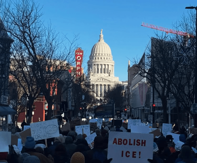 - Members participated in an ICE Week of Action building up to a January 30th walk-out + march and the January 31st Madison Anti-ICE Community Meeting organized by MADSA. This included Know Your Rights training, group discussion, opportunities to generate concrete political demands, and information about next steps to build networks of community support. Organizers will continue to meet around this work.